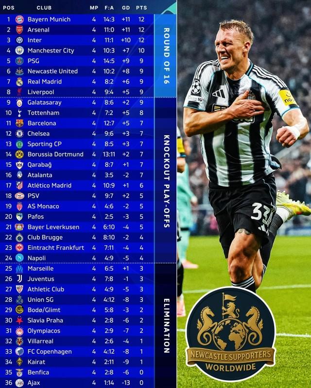 歐冠聯(lián)賽階段第4輪,紐卡主場2比0畢爾巴鄂,丹·伯恩首開紀錄,若埃林通鎖定勝局,托納利當選MVP。喜鵲3勝1負排名第6,與巴黎、利物浦、皇馬同分。 本季歐冠英超球隊8次出戰(zhàn)西甲球隊,以7勝1負占壓倒性優(yōu)勢。紐卡的勝利宣告英超6支歐冠參賽隊本輪5勝1平的強勢。在前4輪24場比賽中,英超球隊17勝4平3負,在前4、前8、前10、前12均占半壁江山。其中阿森納(4勝)、曼城(3勝1平)、熱刺(2勝2平)保持不敗。阿森納進11球失0球,與拜仁并列榜首,下輪兩隊將直接對話。